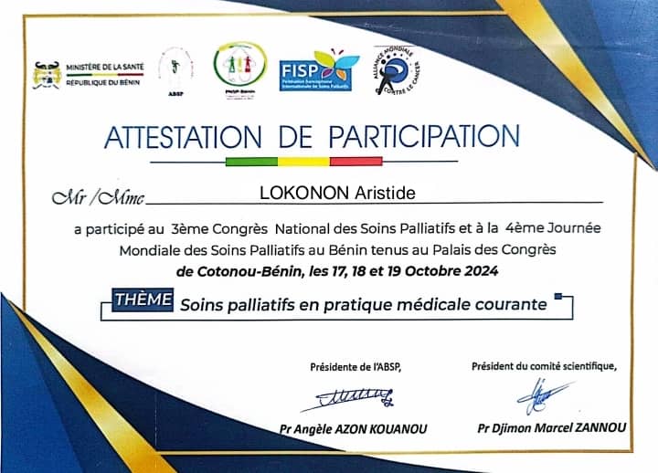 Mr Lokonon Aristide a participé au 3ᵉ Congrès National des Soins Palliatifs et à la 4ᵉ Journée Mondiale des Soins Palliatifs au Bénin, tenus au Palais des Congrès de Cotonou les 17, 18 et 19 octobre 2024, autour du thème « Soins palliatifs en pratique médicale courante »